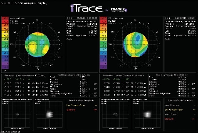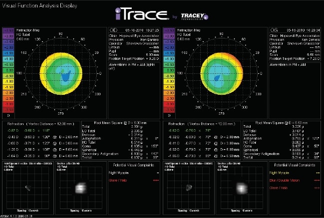 The iTrace listed potential visual complaints of night myopia, glare/halo and blurred/double vision and represented those effects with the Point Spread Function and Simulated Snellen E, thus objectively confirming the patient's subjective complaints.
