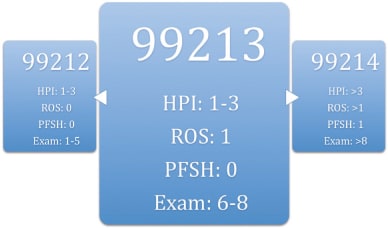 I have become extremely efficient at identifying the 99213 visit, which serves as a benchmark from which I can easily determine if a visit should be coded at a higher or lower level. If the office visit notes are not consistent with a 99213, then I determine if each component of the visit has more or fewer requirements fulfilled than needed for 99213. A 99212 visit, for example, has the same HPI requirement (one to three elements) as a 99213, but it requires no ROS and PFSH elements, and one to five elements of the examination. For an established office visit, you need to meet the criteria for two of the three components.