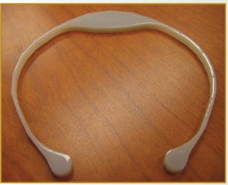 The Gold Shunt GMS Plus implant (SOLX, Waltham, Mass.) follows an alternate suprachoroidal approach to bypass the restrictive trabecular meshwork and inner wall of Schlemm's canal. The 24k gold device (5.6 mm x 3.2 mm x 80 microns, or about the thickness of a human hair) is inserted into the anterior chamber through a 3-mm limbal incision and bridges into the supraciliary space. The shunt is designed with tubular baffled channels, not all of which are open at the time of implantation. Additional channels can be opened by laser application to the visible portion of the shunt in the anterior chamber. (See figure 3, below.)