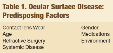 This table lists the predisposing factors for ocular surface disease. Also see the article, "Why So Dry?", for additional information.