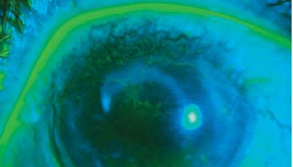 Figure 1. Lissamine green staining of cornea and bleb in patient with OSD and bleb dysthesia.
