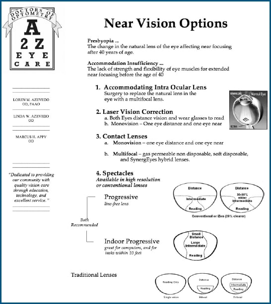 The emergence of the Internet and high definition videos may someday render paper-based education and instructions obsolete, but at our practice, I've found that a summary handout is very effective for presenting all the presbyopic and accommodative insufficiency (AI) options to patients. Our staff does this with an informative page, titled Near Vision Options (see below). In this presentation, wording is crucial, and as our staff speaks to the patient, we often draw on the handout to emphasize the points we make. For example, the staff might circle the intermediate zones of both the indoor (or computer) lens and the progressive lens to illustrate the difference in the size of each zone.