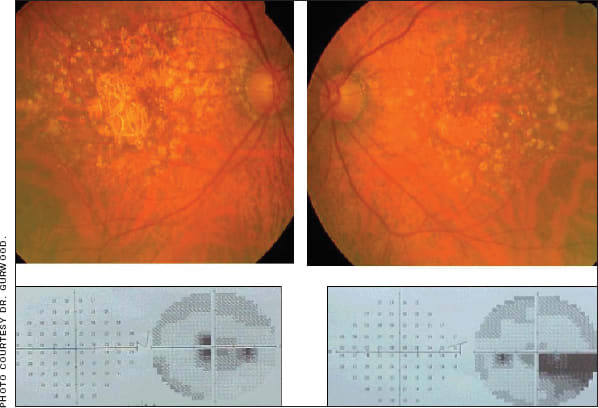 This patient developed dry AMD OU with corresponding visual field loss.