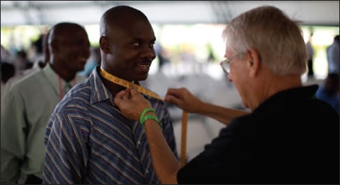 Ms. Suter was among several volunteers who measured Haitian pastors for new suits.