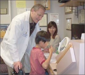 Dr. Lipson with a new OCR patient and his mother as the nine-year-old patient prepares to apply his OCR lens.