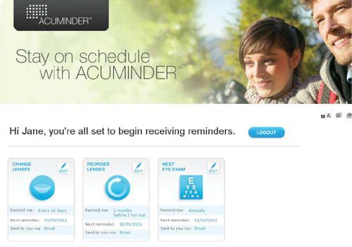 Acuminder (www.acuminder.com) is a free online service that sends automatic reminders to patients via e-mail and/or cell phone text message about when it's time to change their lenses, buy new lenses and/or schedule an eye exam. And, it's available to all contact lens wearers, regardless of what brand of lenses they wear.
