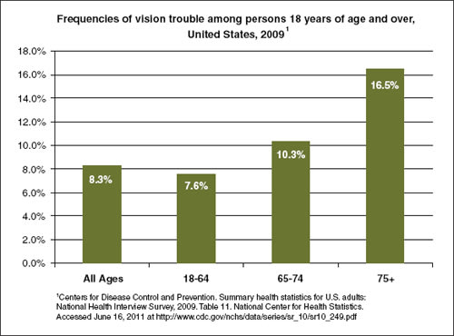 Figure 1. The prevalence of vision trouble in the 65-74 (10.3%) and 75+ (16.5%) cohorts significantly exceeded those aged 18-64 (7.6%).