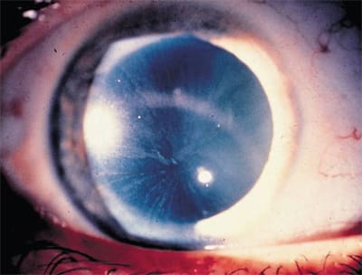 ► Corneal verticillata. A total of 90% of Fabry disease patients have corneal whorling, in which dense bronze to cream-colored rays radiate from the center of the cornea.1 The corneal whorling occurs in the subepithelium, or Bowman's layer, of the cornea. A slit-lamp exam can enable you to detect the vortexshaped pattern on the cornea associated with whorling.