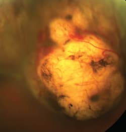 A Caucasian male in his 60s recently presented for his routine eye exam. The patient was relaxed and happy, and I was rewarded with a satisfying “Oh wow! That's so much clearer!” at the refraction's end. It was the kind of exam that makes you glad you practice optometry. But, during the posterior segment dilated fundus exam, my heart sank. There, as plain as day, was a large, raised lesion in the posterior pole. It was mostly non-pigmented, but it had a small area on the nasal border that was dusky-gray. I didn't detect any vascular abnormality on or near it, and there weren't drusen overlying it. Overall, it looked ominous. My mind began picking its way through its filed-away facts about choroidal lesions, so I could arrive at a diagnosis and determine the best management for the patient.