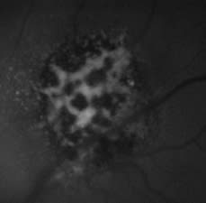 Fundus autofluorescent imaging (FAF) of a small, amelanotic choroidal melanoma in the superior arcade. Note the bright clusters, which represent lipofuscin on the evolving collar button of the tumor.