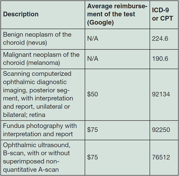 ► Fundus photography. Due in part to the advent of low-cost digital photography, it is currently the standard of care to photograph choroidal nevi. Because choroidal nevi can convert into melanomas, and lesion size plays major role in differential diagnosis, a baseline fundus photograph is essential to monitoring for growth. Further, it is essential you fully evaluate the fundus of each and every patient, and carefully note the size of any potentially suspicious lesions. Several retinal imaging devices include image comparison software, enabling you to carefully monitor lesions for any increase in size. Or, you can use detailed fundus drawings, carefully marking the position of overlying retinal vasculature for monitoring lesion size increase at follow-up visits. Often, it isn't easy to obtain reimbursement for serial photographs. Your experience will vary, but if your clinical evaluation suggests an ophthalmoscopic change, prompting confirmation with photographs, it might make any appeals for reimbursement denial easier. (See “How do I Code for That?” below.)