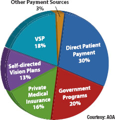 “No,” says Charles B. Brownlow, O.D., a practice management consultant, who has presented more than 400 lectures on medical record keeping and has served as a consultant for several major healthcare consulting groups and insurers. “O.D.s comprise possibly the only healthcare profession that still has a significant percentage of ‘private pay’ patients,” he says. “This proves to be advantageous to patients, as O.D.s' charges are partially based on real ‘actual’ fees, whereas healthcare professionals with few or no private pay patients are free to set their fees higher, in hopes of capturing higher payments from insurers.” He adds that the non-medical eyecare segment of typical optometrists' practices remains significant, as many Americans remain without insurance coverage for exams without medical reasons and eyewear.