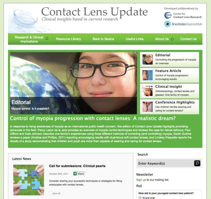 (5) www.contactlensupdate.com. This is relatively new web-based organization devoted to being a “one-stop shop” for practitioners. The website is organized by the Centre for Contact Lens Research of the University of Waterloo, Canada, and the Brien Holden Vision Institute in Sydney, Australia. Both organizations say the site will feature articles from the experts, highlights from contact lens meetings, clinical images and videos of complications, educational tools, links to related sites and a means of tailoring the site to each user. Although the site is under construction, it currently offers a “Useful Links” section and a “Resource Library,” which houses a photographic scale for a range of contact lens-related conditions.
