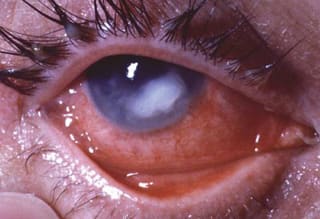Image 2: Note how this fungal keratitis infiltrate is gray with feathery borders.