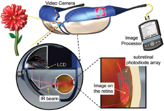 Specifically, the prosthesis includes a pair of goggles armed with a miniature camera and a pocket PC designed to process the visual data stream. A liquid crystal microdisplay implanted in the goggles (akin to what's employed by video game goggles), would display the resulting images, the article explains. How so? The LCD would beam the images using laser pulses of near-infrared light to a photovoltaic silicon chip — one third as thin as a strand of hair — embedded underneath the retina. Electric currents from the chips' photodiodes would then trigger signals in the retina, which are delivered to the brain, enabling the aforementioned patients to regain vision, though not in color and far from normal.