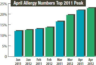 A total of 22.8% of the U.S. population suffered from allergies last month, surpassing April 2011 (20.8%) and even last year's peak of 22.1% in May 2011, according to Gallup-Healthways data. Further, the rise in spring allergy numbers was likely spurred by the unseasonably warm winter, the company says.