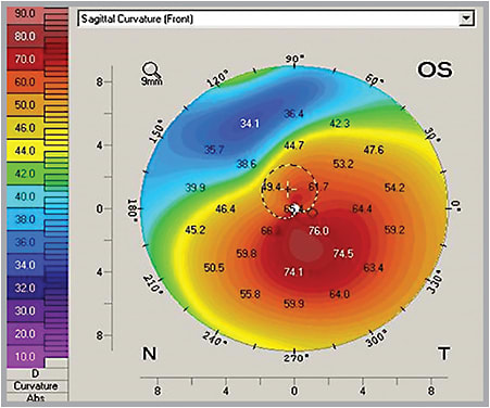 Patients who have progressive keratoconus or ectasia and are between the ages of 9 and 35 may be candidates for CXL.25,26 The reason: As patients age, the cornea tends to cross-link itself, which results in reduced progression of the disease.25,26,27 Research has shown that the effect of cross-linking is less pronounced in patients older than age 40, although this group still showed improvements in refractive, topographic and aberrometric results.27 Also, research suggests that, ideally, corneas less than 58.00D should be treated, although corneas steeper than this can be treated at the surgeon’s discretion.15 There is, however, an increased chance of sight-threatening corneal haze in advanced keratoconus.15 In cases in which corneal progression is questionable, topographies taken six months to one year apart may detect differences.