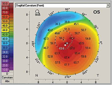 A little over two years post-CXL, the topography reveals flattening up to 7.00D to 8.00D in the same patient. Their BCVA with piggyback contact lenses was 20/70 prior to CXL and 20/25 at the 28-month mark.