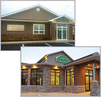 Dr. Klosterman’s new practice (top) is 3,500 square feet with a drive-through pick-up window for contact lens patients. Dr. Wesley’s new practice is 3,500 square feet with a 900 square feet second level and six exam lanes.