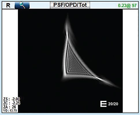 The Point Spread Function (PSF) shows what a point of light looks like when imaged through the patient’s optical system; in this case it explains his night-time glare shaped “like a cross.”