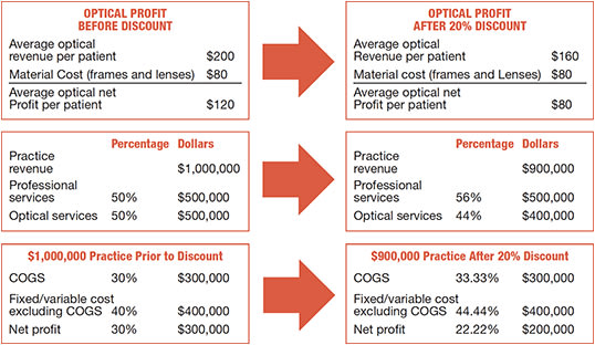 Nobody likes to see his or her net profit decrease by $100,000. Maybe the practice owner thinks his 20% reduction in fees will attract more patients and, therefore, offset the net profit reduction. To make up the difference, the practice owner would have to generate an extra $150,000 because the cost of goods (COGS) is now 33.33% instead of 30%. The average revenue per patient is no longer $400, but is now $360 ($160 optical + $200 services). To make an additional $150,000, this practice would have to see 417 more patients (417 x $360 = $150,120).