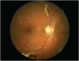 Above, a dilated exam of a 55-year-old female with Type II DM and hypertension revealed proliferative diabetic retinopathy (PDR) OD. Her last eye exam was five years ago. Had she undergone yearly diabetic eye exams, early treatment would have been initiated before the development PDR.