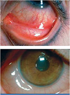 Figure 1 Signs of allergic conjunctivitis include hyperemia (top) and conjunctival edema (bottom). From: Luchs J. Multi-drug Treatment for Allergic Conjunctivitis. Refractive Eyecare 2008;12(8):1,30-31. Used with permission.