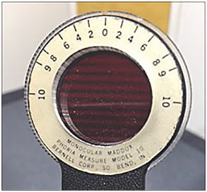 If the eyes are aligned, measure the phoria and fusional vergence reserves. When the child isn’t able to perform these tests traditionally behind the phoropter, use a red Maddox rod that has a built-in rotary prism in free space held over one eye, while the other eye fixates on a light at distance and then at near. To get the patient’s attention, I tell him, “We’re going to create a laser beam together.” To measure fusional reserves, use a prism bar while the child looks at a target of interest. If your patient isn’t able to tell you when he sees double, watch for his eyes to look back and forth as the target splits into two to determine whether his eyes are working together.