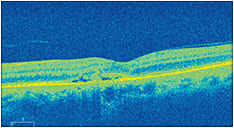 A 60-YEAR-OLD Caucasian female presented complaining of decreased vision OS for six months. A previous eye doctor told her, three months prior, that she had “blister-like swelling” on the retina of her left eye, but the patient failed to follow-up due to a move to another state. She denied symptoms of pain, floaters, flashes of light, trauma, systemic disease, medication use or smoking. Her BCVA was 20/20 OD and 20/50 with no improvement on pinhole OS. Pupils and ocular motilities were unremarkable. Confrontation visual field revealed a central scotoma and metamorphopsia on amsler grid testing OS.