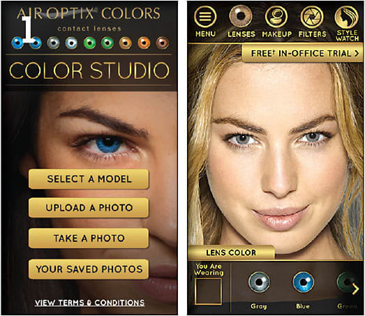 AIR OPTIX COLORS Color Studio app for iOS devices, from Alcon, allows users to upload a photo and virtually “try on” any of the nine colors of lenses.