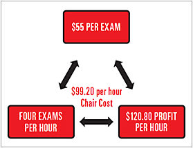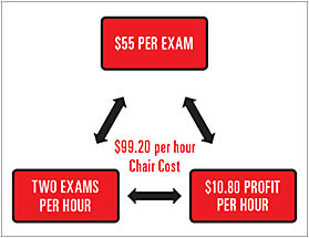 If a MVCP reduces its reimbursement per exam and you don’t increase your volume of patients per hour, then your profit from your services will decrease as well. Let’s show you two scenarios (see Figures 3, 4, 5 and 6) that assume your practice has a chair cost (more on this in minute) of $99.20 (or about the national average).