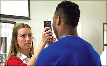 Dr. Amanda Nanasy using Vergel (Bernell), another sports vision tool. It measures near point conversion, part of pre-concussion testing.