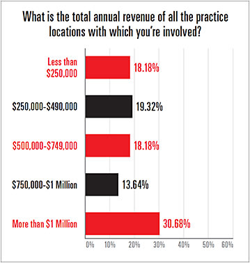 About half the respondents reported working solo in private practices, while another 25% reported working in group practices (see the chart on p. 19). Most respondents, 69.3%, worked at practice locations made up of 10 staff members or less (see the chart on p. 20). About 30% of respondents reported total annual practice revenues of more than $1 million, while 19.3% reported $250,000-$499,000 (see the chart on p. 20).