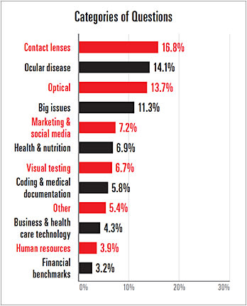 From there, we eliminated questions that would elicit too broad an answer, such as, “How do you code?” or “What goals should I set for my practice, and how should I set them?” We then eliminated questions that didn’t deal directly with optometry. As a final step, we collaborated with Chief Optometric Editor Scot Morris, O.D., to edit the list down to about 80 questions that would be of greatest interest to our readers.