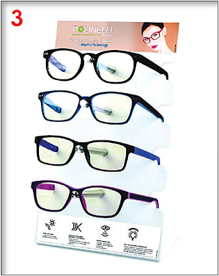 Polinelli premium reading glasses with BluePro Technology, from Eschenbach Optik of America, include a lens coating to protect from blue light and reduce symptoms of digital eye strain; they also block UVA/UVB rays. Each reader is available in a range of powers, from +1.00D to +2.50D, in 0.50D increments in all styles. ■