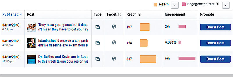 Identify what posts generate the most engagement, and simply create more of them. To do so, navigate to your page’s “Insights” tab and then the “Posts” section. For example, I have learned that my page’s most engaging posts often involve videos of our team and actual patients. To maximize our chances of ending up in our fans’ newsfeeds, we make it a point to create more videos highlighting actual patients and their experiences.