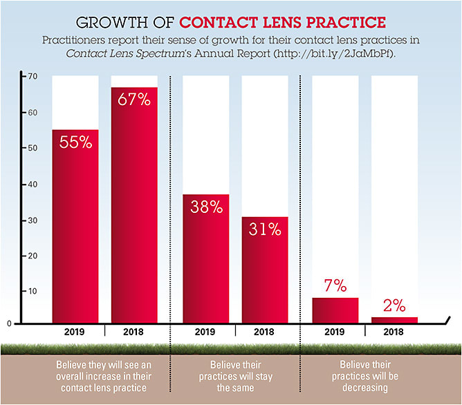 Contact lens-activated inflammation manifests as unsightly conjunctival hyperemia, itching, lacrimation and irritation. The appropriate steps to prevent and manage contact lens-induced inflammation are essential for patient satisfaction and a robust contact lens practice, as when not treated, the outcome is contact lens dropout, disgruntled patients and lost revenue. As a majority of practitioners foresee growth in the contact lens category, as seen in the chart on p.22, there is a chance contact lens-related inflammation could affect larger numbers of patients. Knowledge of the root cause of the inflammatory event will guide the appropriate treatment. Here are several etiologies of contact lens inflammation and methods to mitigate symptoms.