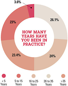 About 65% of responses report practicing in single-location practices, while 35% report working in multi-location practices.
