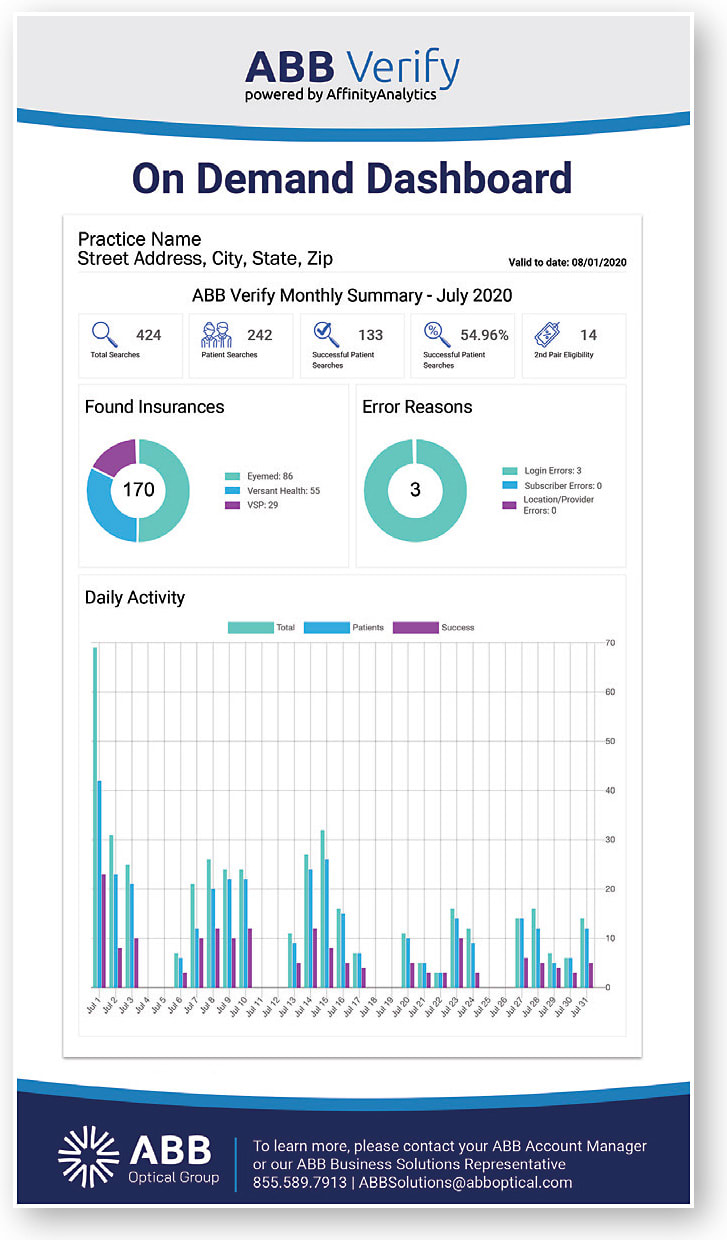 ABB Verify On-Demand is a tool we use to check the vision care eligibility of patients who have scheduled appointments and pull plan authorizations, when needed. The platform is web-based; front desk staff members manually enter the patient’s information into the site to acquire verification.