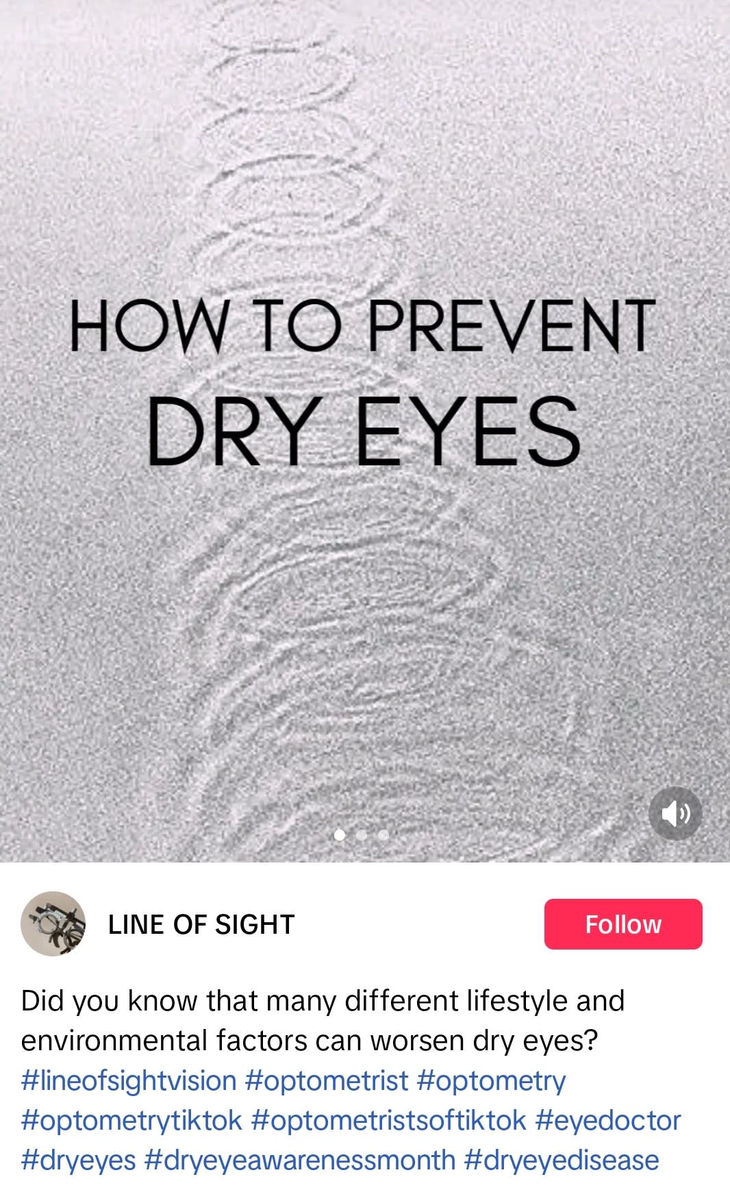 Use the caption to share relevant information or request a call to action to your website link, office number, or direct messaging. Hashtags help new followers find you on social media. Choose ones that are relevant to the topic and specific to your feed. For instance, in a recent post for July’s Dry Eye Awareness Month, we shared tips on keeping eyes healthy and used the caption to give context for our advice that included hashtags like #dryeyes, #dryeyawarenessmonth, #dryeyedisease, #optometry, and #optometrytiktok to make it more visible to people searching for those terms (Figure 1.)