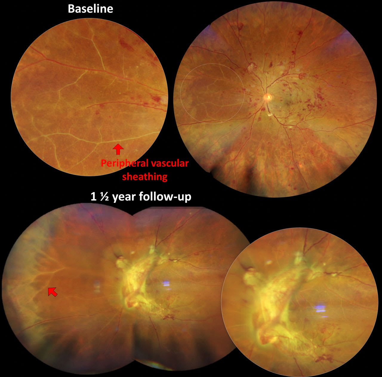 Subretinal fluid in DME decreases with anti-VEGF therapy and intravitreal steroids. The latter’s drying effect supports the hypothesis that subretinal fluid is driven primarily by inflammation.4,9 Based on my clinical experience, vascular staining, especially when widespread and diffuse, upon intravenous fluorescein angiography is suggestive of either inner retinal ischemia, inflammation or, in most instances of advanced DR, a combination of the two. The clinical correlate that may sometimes be visualized is vascular sheathing (Figure 2).
