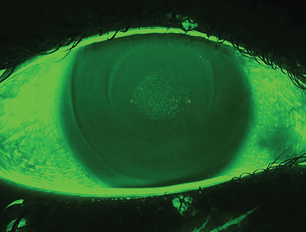 • Lens-caused mechanical trauma. Ortho-k lenses work by applying controlled pressure on the central cornea, inducing temporary epithelial redistribution.2 Overnight wear in a closed-eye environment further reduces tear exchange, delaying epithelial recovery. Due to the unique overnight wear modality, the 1-day follow-up is preferably scheduled in the early morning to maximize the likelihood of detecting subtle epithelial defects, which may rapidly heal within a few hours after lens removal.