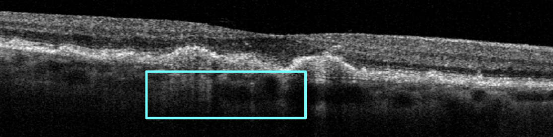The earliest OCT biomarker for GA is choroidal hypertransmission defects—bright columns extending under the retina and into the choroid due to a compromised RPE (see Figure 2). This structural change on OCT can be observed before visible retina atrophy, making it a crucial early warning sign that should prompt clinicians to educate patients and tighten the in-office monitoring schedule.