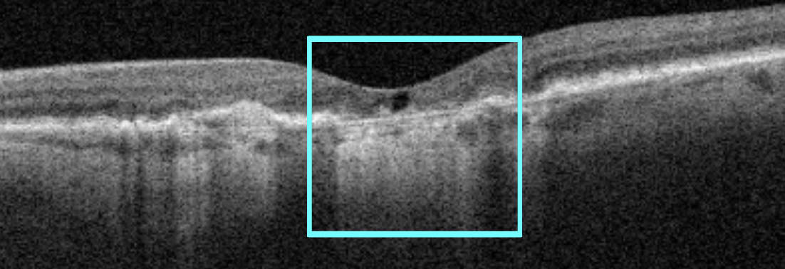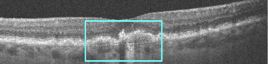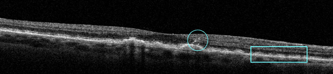 OCT can also identify the earliest signs of GA formation. Incomplete RPE and outer retina atrophy (iRORA) is identified on OCT when hypertransmission defects are seen beneath an area of RPE attenuation that is accompanied by photoreceptor degeneration in the outer retina. Other findings of iRORA also include loss of the external limiting membrane; disruption of the ellipsoid zone; and a hyporeflective, wedge-shaped band in the outer plexiform layer (see Figure 3). The Classification of Atrophy Meetings (CAM) group has identified iRORA as “nascent GA”—a signal that the progression to GA has begun.1