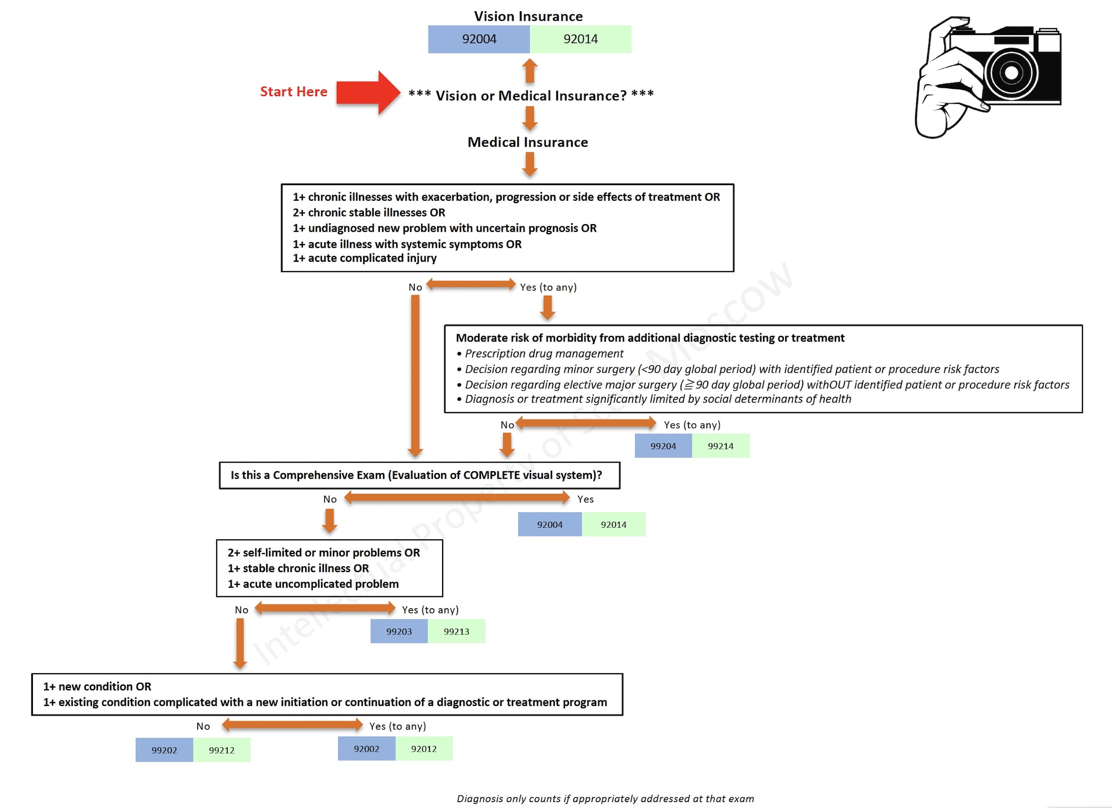 Specifically, his course taught a systematic way to select the appropriate 92XXX code (Ophthalmological Services) or 99XXX code (Evaluation & Management) using a cheat sheet (below) to bring back to your office, so the attendee can implement these skills immediately.