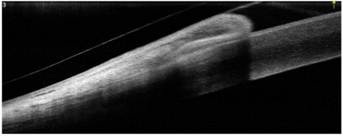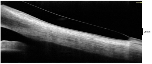 The excessive inferior clearance was not concerning, as there were no signs of conjunctival swelling or prolapse on OCT (see Figure 3) and no limbal hyperemia on slit lamp examination. Good edge alignment was found at 360º, showing conjunctiva covering half of the lens edge thickness on OCT. The trial was dispensed to the patient, and a follow-up exam was completed 1 week later. At the follow-up appointment, after 5 hours of lens wear, the central clearance was 205 µm, the limbal zone showed no change, and no conjunctival prolapse was found inferiorly in the area of excessive limbal clearance. The edge alignment was improved superiorly and temporally, no blanching was present on slit lamp evaluation, and the patient reported no foreign body sensation. The lens was removed, and sodium fluorescein stain was instilled. No staining or impression ring pooling were present on the cornea or conjunctiva. The scleral lens prescription was finalized, and the patient was instructed to return to care in 6 months for a scleral lens progress examination and possible fitting of the right eye.