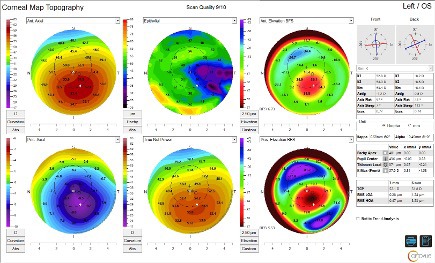 Topography (Optovue Solix, Visionix, USA) showed obvious signs of keratoconus including characteristic corneal thinning decentered inferior temporally with adjacent corneal steepening (see Figure 1). Evaluation of the surfaces of the cornea revealed more significant elevation on the posterior corneal surface than the anterior surface when compared to a best fit reference sphere. Most patients with keratoconus demonstrate epithelial remodeling, typically with thinning over the corneal apex surrounded by a ring of epithelial thickening. In this case, the patient showed that characteristic appearance, though the area of thinning was slightly decentered from the apex.