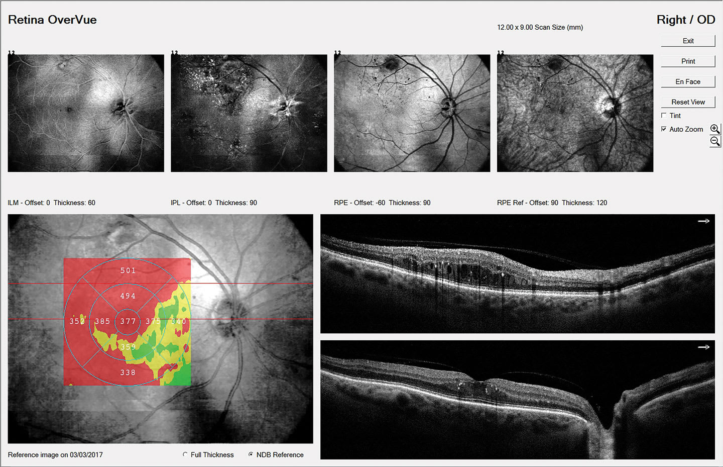 An important caveat regarding staging: Diabetic macular edema (DME) can occur at any stage of retinopathy, from mild NPDR all the way through proliferative disease.10 Diabetic macular edema remains the leading cause of moderate vision loss in patients who have type 2 diabetes, exceeding the vision loss from frank retinopathy. What’s more, it is estimated that nearly 745,000 people, or 3.8% of all patients who have diabetes in the United States, have DME. However, 55% of these patients are unaware they have it, underscoring the importance of detection even in asymptomatic patients.11 Therefore, careful evaluation of the macula for any exudation and/or thickening with optical coherence tomography (OCT) is crucial in all patients who have diabetes.12 Patients who have center-involved DME (ie, the center 1 mm subfield on the OCT showing edema; Figure 7) should be referred to a retinal specialist for consideration of treatment within 2 to 4 weeks.
