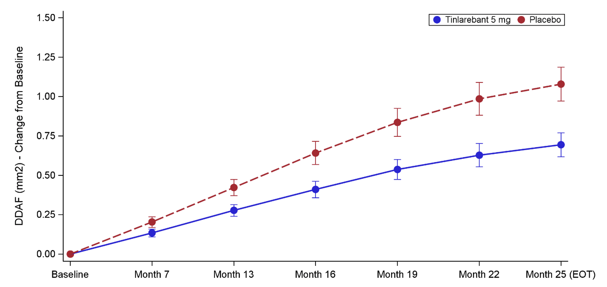 Regarding positive efficacy results, tinlarebant achieved the primary efficacy endpoint demonstrating a statistically significant reduction in lesion growth rate of 35.7% vs placebo (P=.0033) as measured by retinal imaging, when applying an unstructured covariance matrix under the Mixed Model for Repeated Measures (MMRM). To account for the longitudinal nature of the collected data while maintaining model stability given the sample size in the DRAGON trial, a post hoc analysis using an autoregressive covariance matrix under MMRM yielded a treatment effect size of 35.4% (P<.0001).